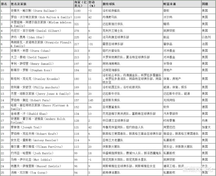 2025年4月消息:《福布斯》杂志发布了2025年全球最富有的运动队老板榜单(身家数据截至2025年3月7日),榜单涵盖北美联赛球队的控股老板:MLB(美国职业棒球大联盟)、MLS(美国职业足球大联盟)、NBA(美国职业篮球联赛)、NFL(美国职业橄榄球联盟)、NHL(美国国家冰球联盟)、NWSL(美国女足职业联赛)、WNBA(美国女子职业篮球联赛),同时纳入统计的还有欧美足球联赛——英超、西甲、意甲、德甲、法甲、英女超、荷甲、葡超、丹麦超级联赛、比利时职业联赛、巴西甲级联赛、阿根廷职业联赛、墨西哥超级联赛。